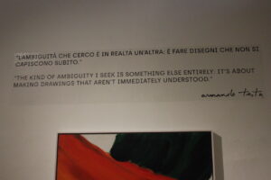 The section dedicated to painting, Testa’s first free and independent medium, is also very beautiful. Then there are the delightful characters that have become part of the collective imagination of both adults and children, like Caballero and Carmencita. The room with the “charging elephants” for the Pirelli advertisement is a wonderfully powerful and modern drawing. And then there’s the body, explored through various media: food, animals, numbers, and letters. In short, Testa’s entire astonishing universe is present. In every room, in every niche or corner, the feeling is one of pleasant amazement, works that are as moving today as they were yesterday.