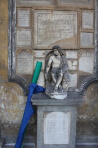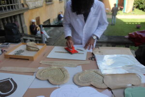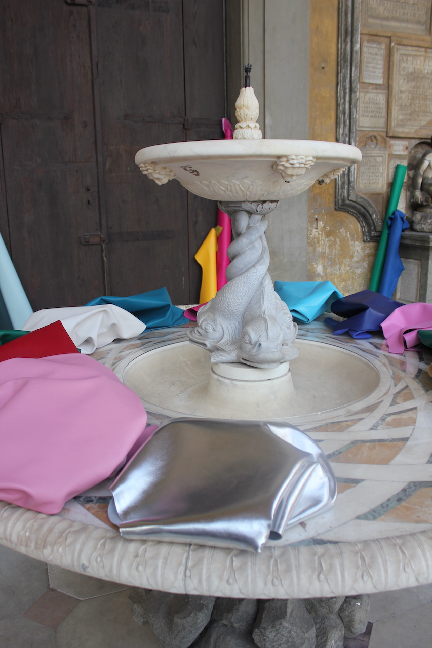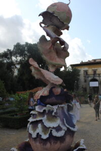 Delizia work by Edoardo Piermattei, a pigmented concrete piece whose aesthetics resemble those of a fine pastry creation (the artist stated he used a tool similar to a real piping bag), yet it has a dual meaning: sweet as sugar, delicious indeed, but also powerful, a metaphor for the power and status of those who once lived in this garden.