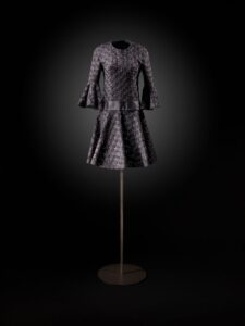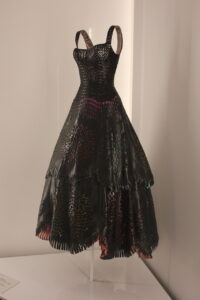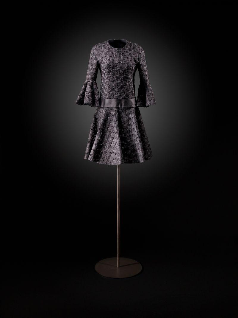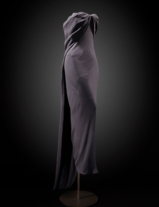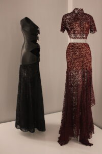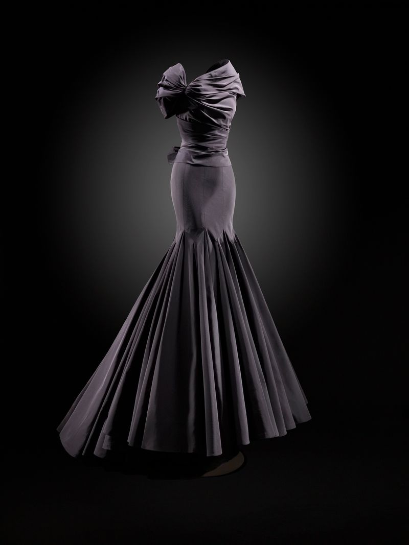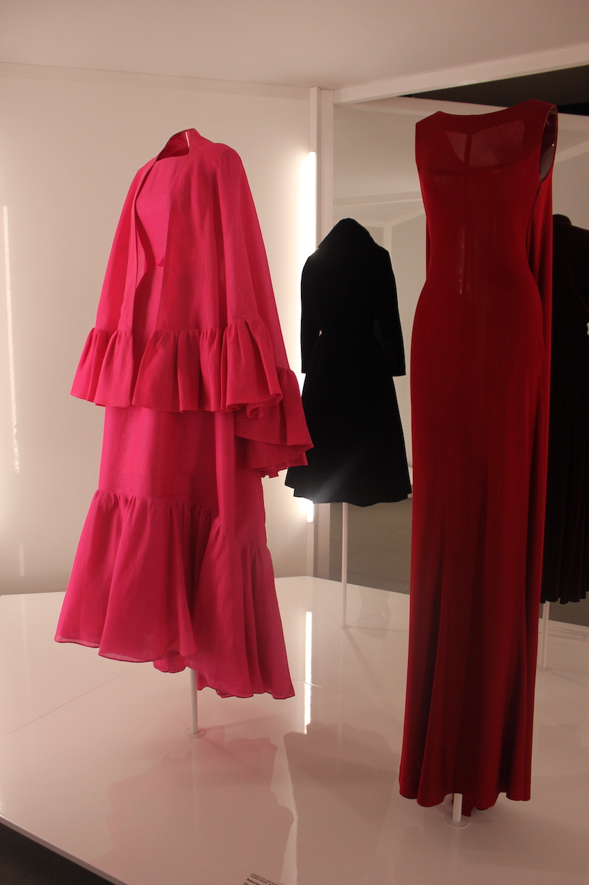 The exhibition opens with two stunning evening dresses: a long, sleeveless, fitted black jersey gown designed by Azzedine Alaïa for the Fall/Winter 1988 Haute Couture collection, and another equally extraordinary gown with a black cloqué silk train and draped bust, designed by Cristóbal Balenciaga for the Fall/Winter 1960 Haute Couture collection.