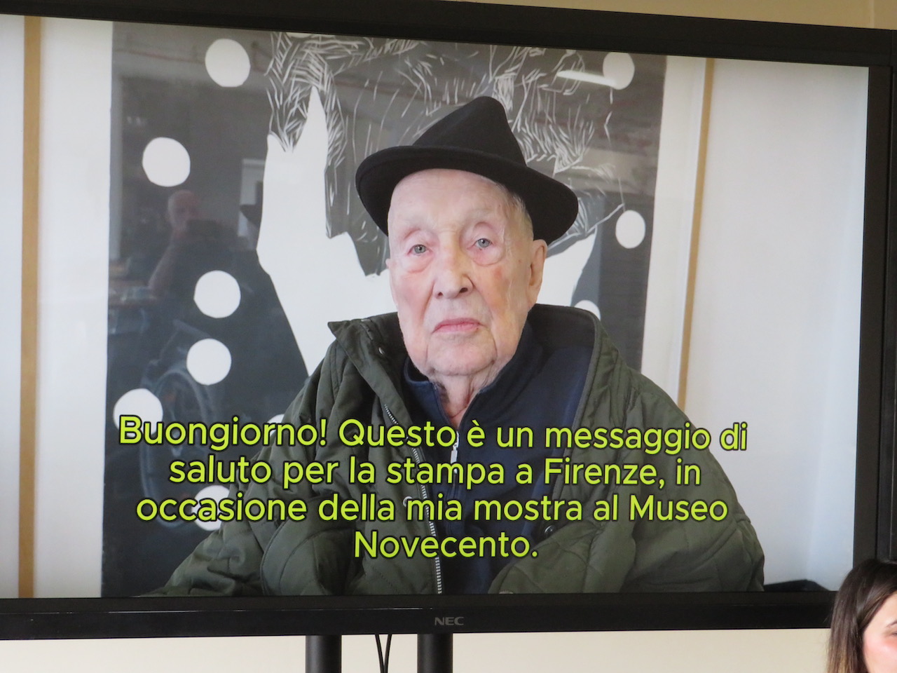 Baselitz in videoconferenza e immagini della conferenza stampa in cui vediamo Sergio Risaliti, il figlio di Georg Baselitz, Daniel Blau, l’assessore alla cultura del Comune di Firenze Giovanni Bettarini.