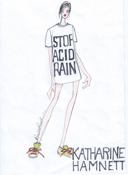 Katharine Hamnet is an English designer who, before anyone else, we are in the eighties, spoke about sustainable fashion, both on the environmental level (she became aware, modifying the production chain, that the cultivation of transformed cotton had a devastating impact on the environment) , both from the point of view of the workers, safeguarding their conditions and their safety. Her most famous creations are those of t-shirts with slogans, a sort of blank sheet on which to express concepts and ideas.