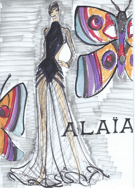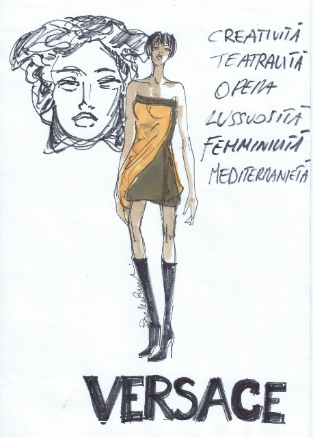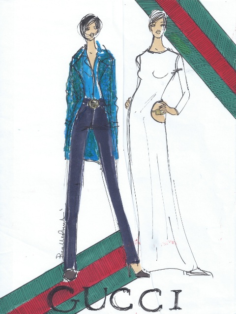 I chose to dedicate two sketches to this Maison, one interpreting two Tom Ford creations since it was, together with Domenico de Sole, the promoter of the relaunch of this historic brand. Ford has made Gucci much more glamorous, amplifying its international success. In this interesting revival, the testimonials, like Madonna, and the beautiful advertising campaigns protagonists of the association with Mario Testino were also important.