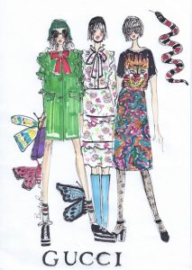 The other sketch sees in the foreground the creations (visions) of his new creative director, Alessandro Michele. Gucci is experiencing a particularly happy period just under his artistic direction, turnover is growing, media attention has never been so morbid towards the brand. Michele has reinvented the Gucci style, with its excesses, mythological and fairy-tale contaminations, creating a very personal aesthetic vision.