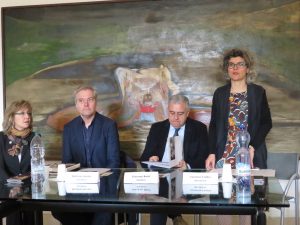 The exhibition curator, Matthias Harder, the Mayor of San Gimignano, Giacomo Bassi, and the councilor for culture, Carolina Taddei.