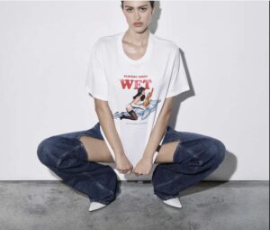 Amelia Gray indossa la collezione Stella McCartney per Jeff Koons. T-shirt Jeff Koons Slippery When Wet.
