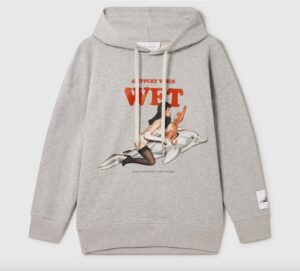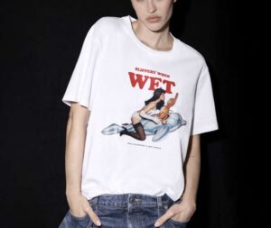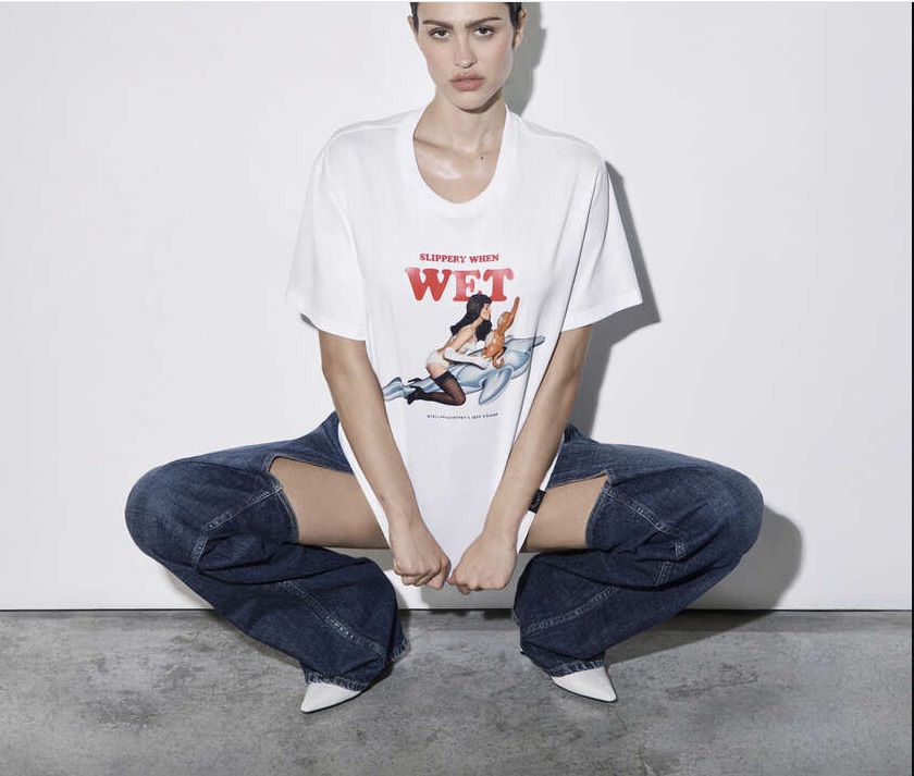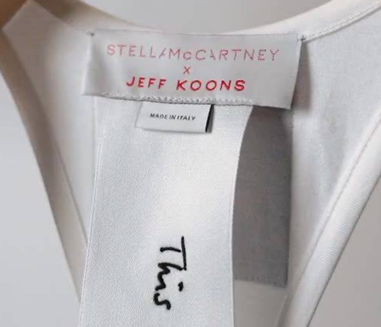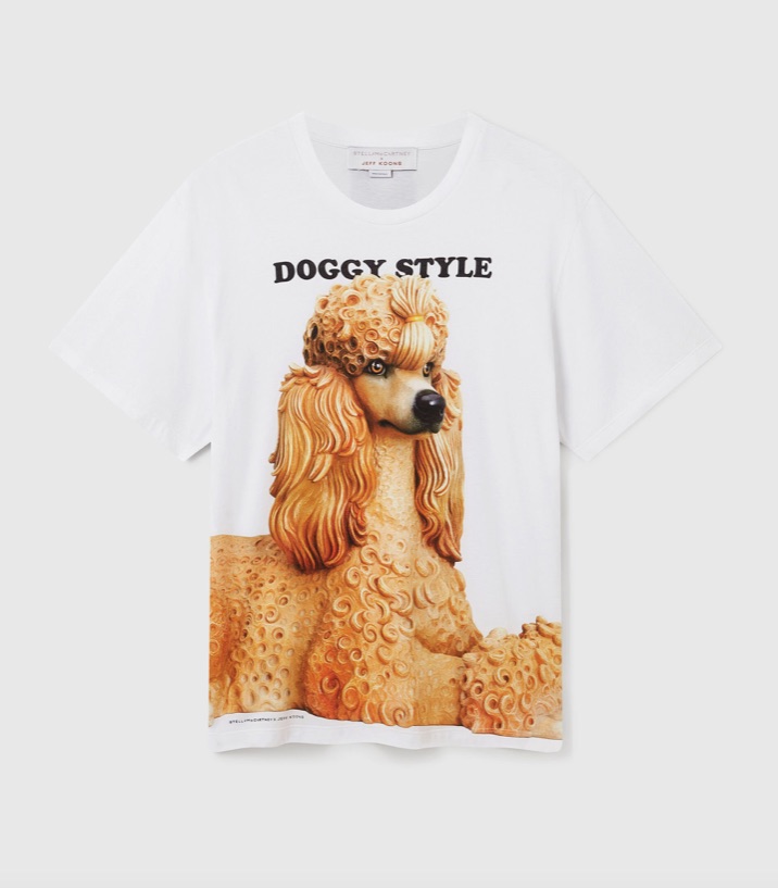 Felpe, T-shirt, tote bag e piccoli accessori diventano le tele ideali per iconiche rappresentazioni di Koons, come l’opera Utitled (Girl with Dolphin and Monkey), così come per gli slogan irriverenti di Stella, per esempio il citatissimo Slippery When Wet, tratto dalla prima collezione della McCartney del 2001.